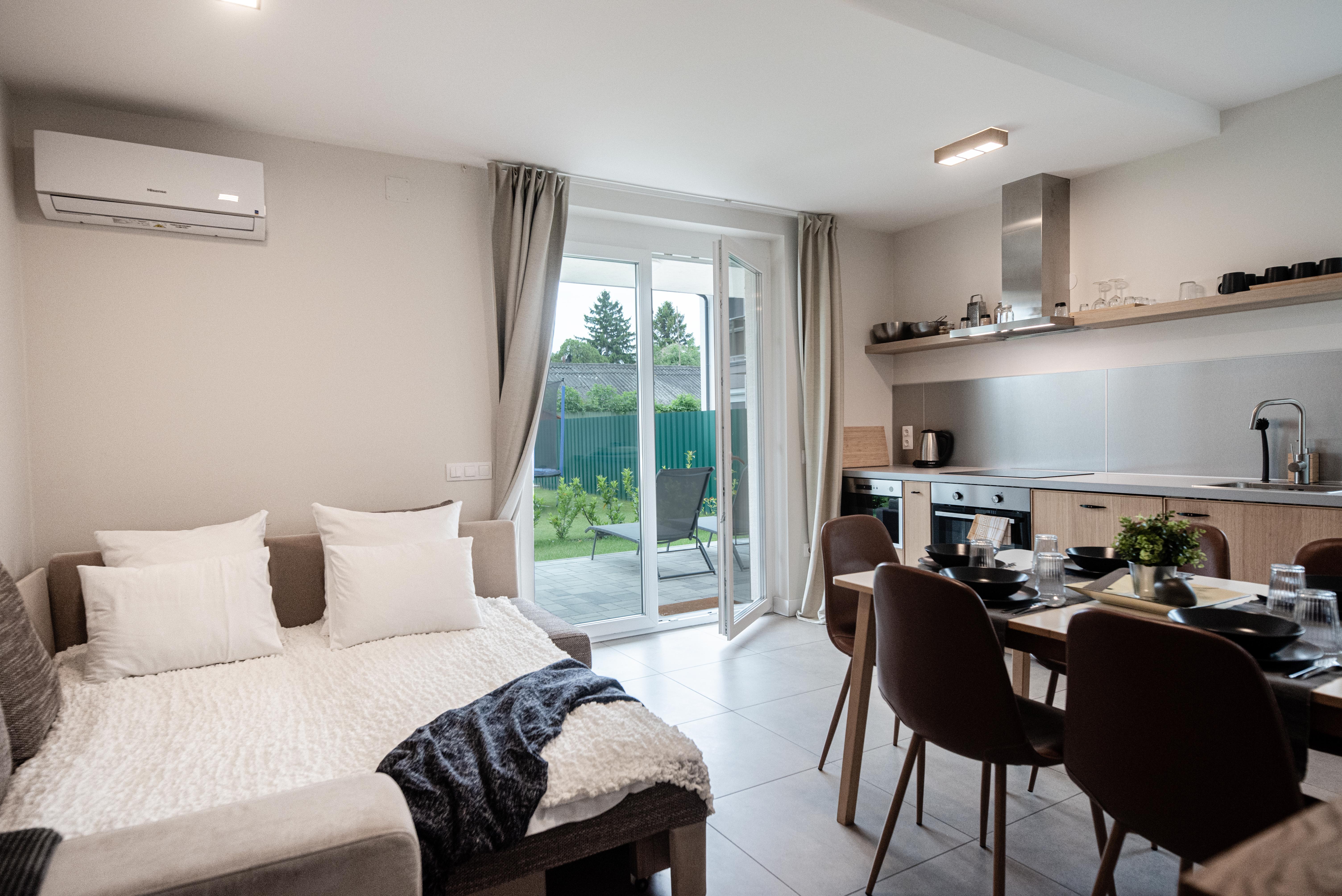 The apartement is situated on the groundfloor of a newly built condominimun. The elegant and refined furnishment and design provides a calm and comfortable holiday. The kitchen is very vell equipped with big and small kitchen appliances - such as a dishwasher, a kettle, a microwave, a coffee-maker, a range hood - the bathroom is spacious. The apartment has a terrace that connect directly to a little private garden. Every flat of the condolminimum can use the common garden and the swimming pool as well. Nearly everything can be reached easily from the apartmenet.